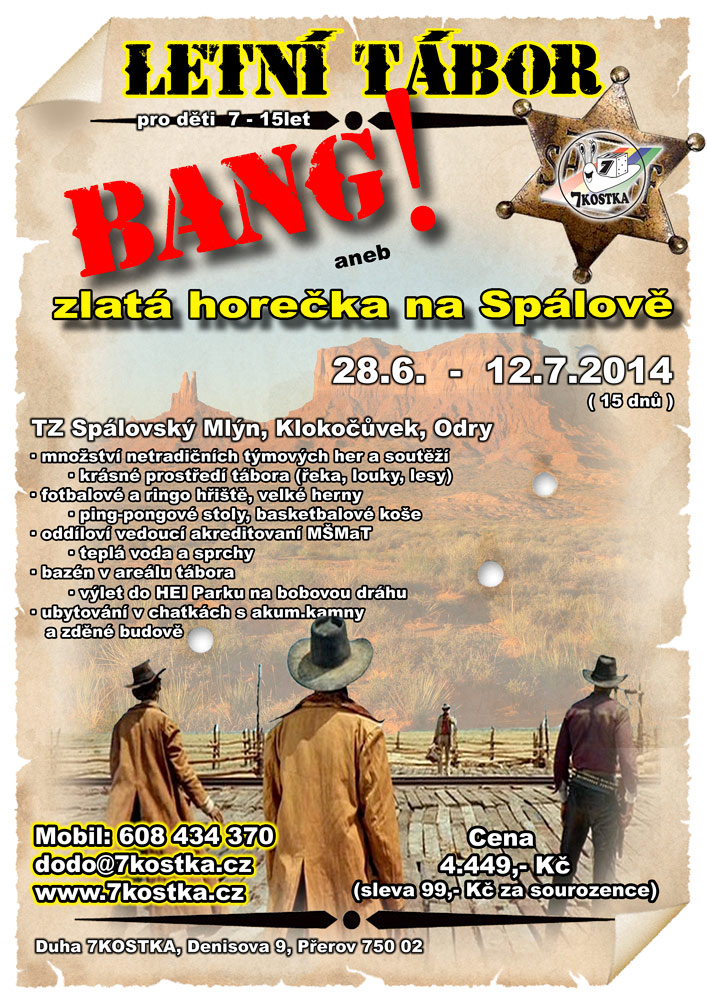 | aneb Zlatá horečka na Spálově | | Typ akce: | tábor | | Datum: | 28.6.2014 - 12.7.2014 (15 dní) | | Místo konání: | táborová základna Klokočůvek, Spálovský mlýn, Oderské vrchy | | Věk: | 7-15 let | | Cena: | Dítě: 4.449,- Kč