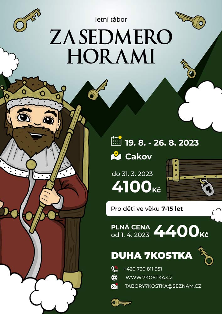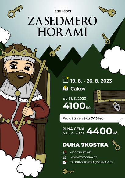 | | Typ akce: | tábor | | Datum: | 19.8.2023 - 26.8.2023 (8 dní) | | Místo konání: | Cakov | | Věk: | 7-15 let | | Cena: | Cena do 31.3.2023 - 4.100,- Kč